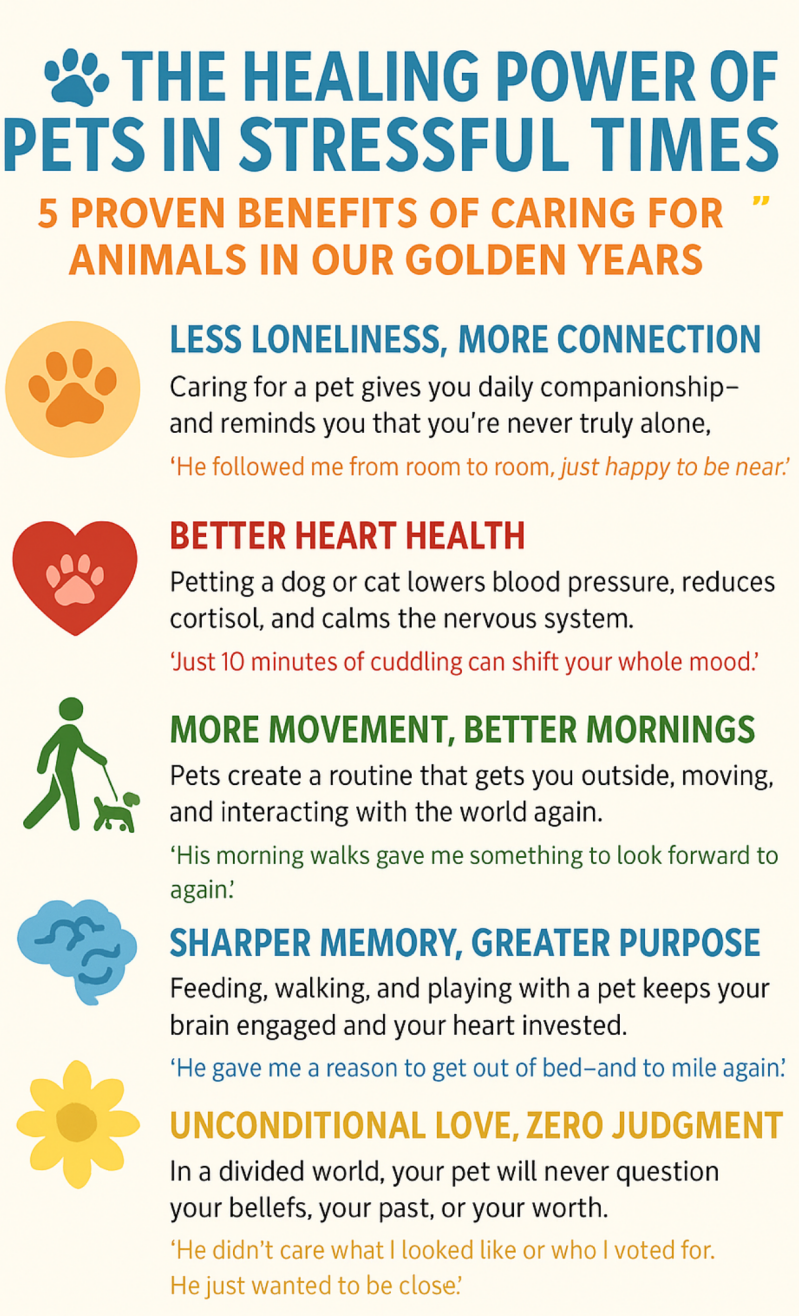 A gentle paw on your lap or a soft purr at your feet can slow your heart rate, ease anxiety, and remind you that you're not alone. They don’t care about your politics, your past, or whether the dishes are done. They see you — the real you — and still think you’re amazing. That kind of unconditional love can soften even the hardest seasons of life. And in return, caring for them gives you purpose. Feeding, walking, or simply sitting with a beloved animal can shift your focus from worry to presence. In that way, pets aren’t just companions — they’re four-legged therapists, tail-wagging life coaches, and sometimes the very thing that brings us back to life when we’ve forgotten how.
